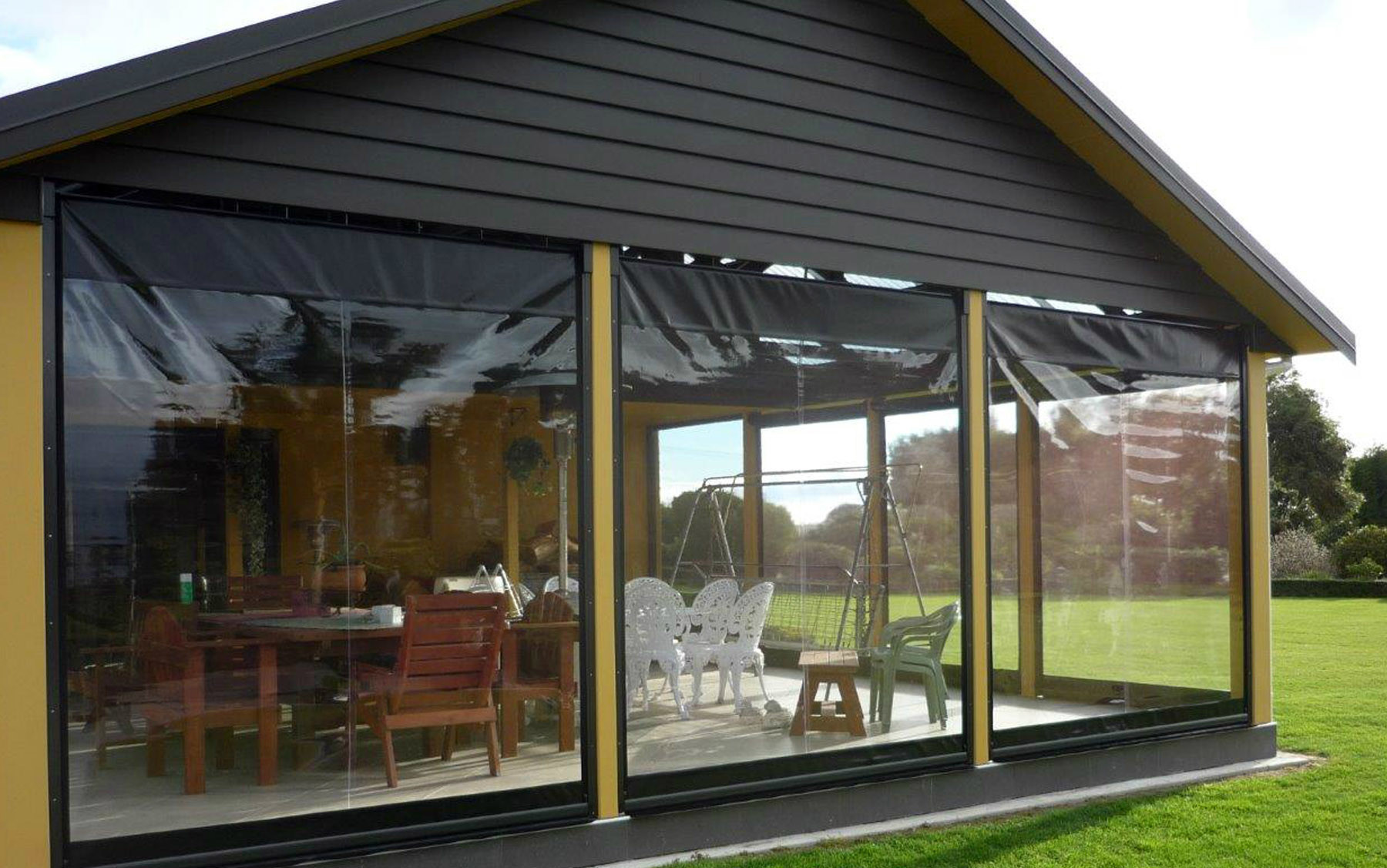 Мягкие окна отлично выполняют функцию безрамного остекления окон веранды или раздвижной террасы